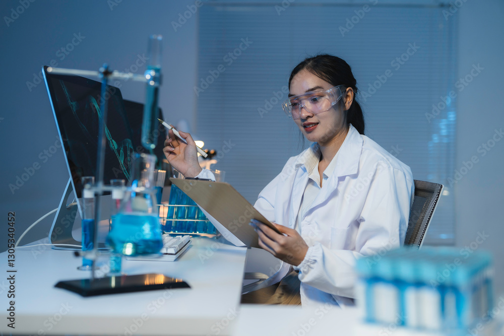 Scientist in white lab coat and safety glasses examining complex data on computer screen, holding clipboard near scientific glassware in high tech research environment