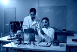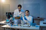 Scientific researchers comparing blue liquid test tubes, noting experimental findings, working near advanced microscopy equipment in contemporary laboratory setting