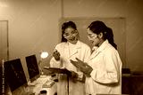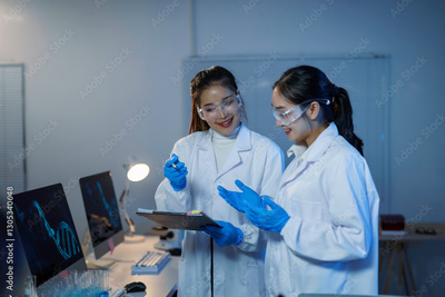 Two Asian female scientists wearing lab coats and gloves discuss data on a clipboard in a modern laboratory, with computer screens displaying DNA double helix structures
