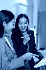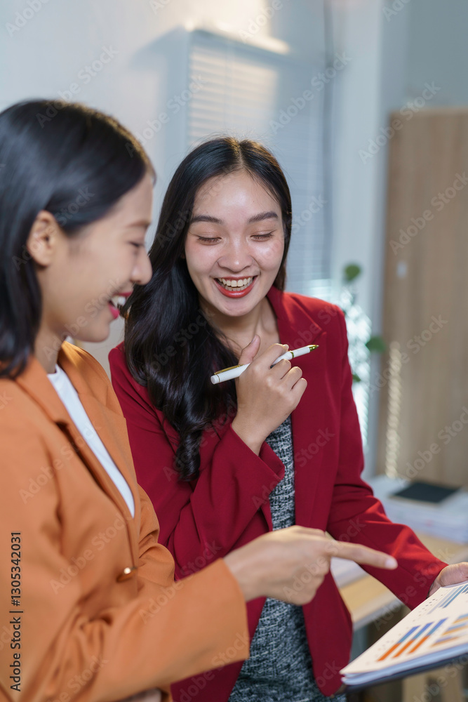 Two asian businesswomen smiling and discussing about financial charts and results, holding a pen and pointing at a document, standing in a bright office