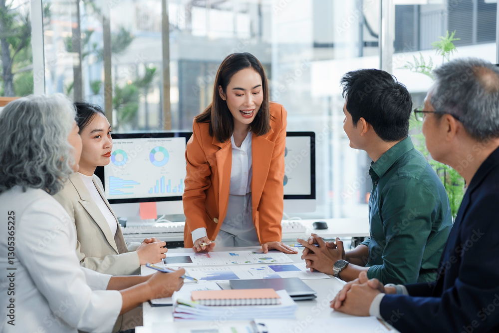 Professional Asian team working together, analyzing financial data on screens, strategizing corporate plans in contemporary workspace with collaborative energy