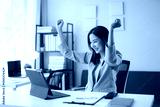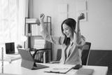 Energetic Asian professional rejoicing, arms raised high, marking career milestone at sleek workspace with laptop and dynamic workplace environment