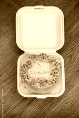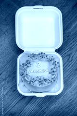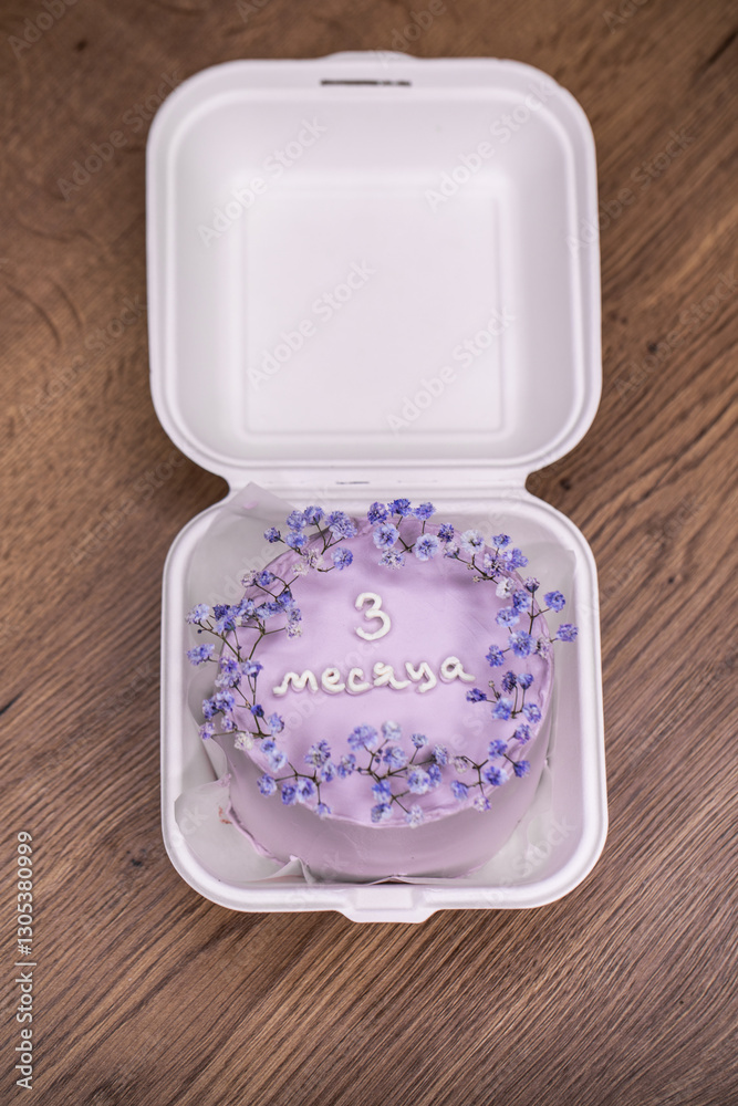 Three months (inscription in Russian) - homemade bento cake in a plastic box on the table