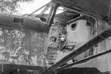 Disassembled cockpit of an old yellow abandoned wrecked airplane