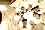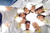 Team of happy diverse volunteers and friends having fun together. From below low angle view group of cheerful smiling multiracial young and elderly people in uniforms huddling looking down at camera