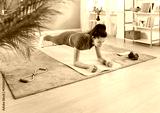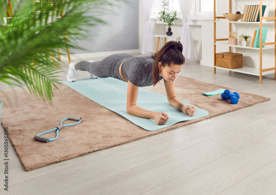 Slim athletic girl having fitness workout at home, doing plank exercise in the living room. Woman in sportswear is standing in plank position on yoga mat. Fitness, wellness and home training concept