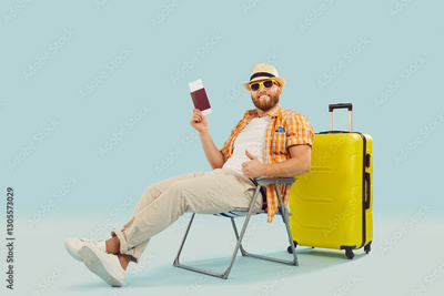 Happy man tourist sits on a blue background with a suitcase, holding passport and tickets, showing a thumbs up gesture. He is ready for vacation travel, smiling as a summer passenger.