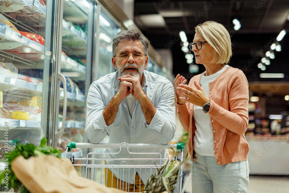 Senior couple arguing while shopping in supermarket, husband looking stressed