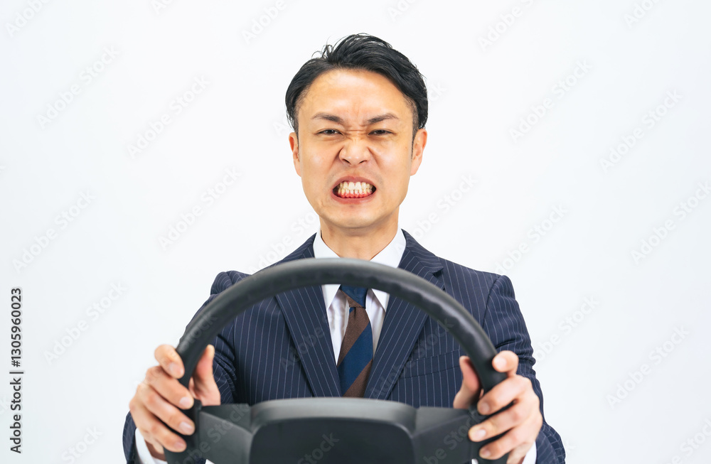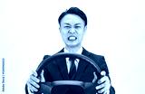 ハンドルを持ってイライラしながら運転するミドルエイジ男性ビジネスパーソン