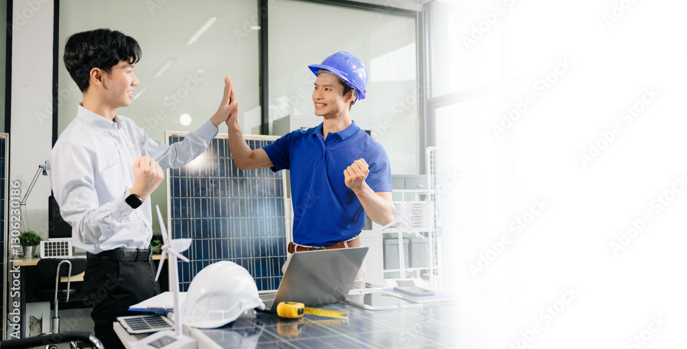 Alternative energy engineers discussing a project with a worker businesspeople a meeting in solar cell panel