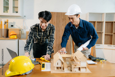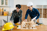 Engineer teams meeting working together wear worker helmets hardhat with on architectural project site