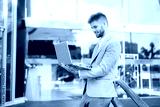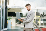 Modern businessman outdoors, using a tablet. Ideal for business, technology, and innovation themes.