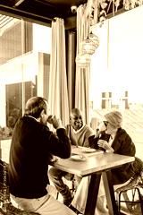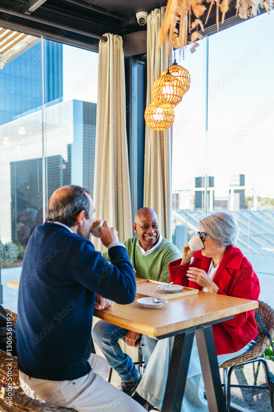 Group of mature friends chatting and drinking coffee at a cafe