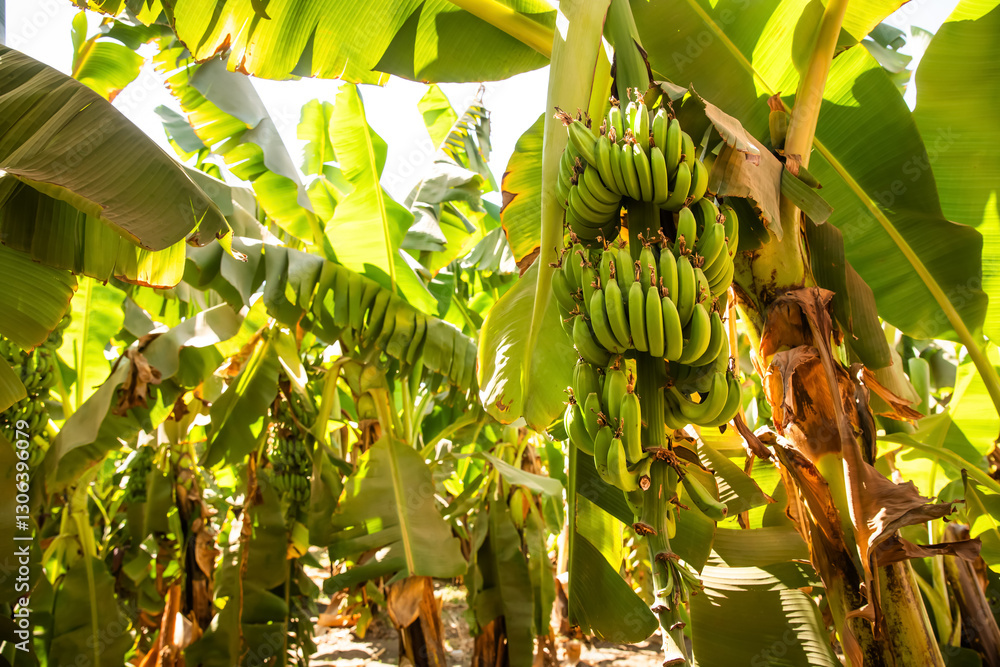 plantacja bananów, banany dojrzewają na drzewie