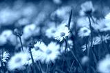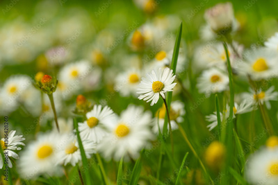 Daisies, Matricaria Chamomilla in meadow, beautiful summer landscape, blossoming camellias natural panoramic background with green field, environmental protection
