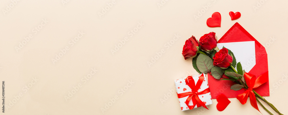 Valentine day composition with Envelope, rose flower and Red heart on table. Top view, flat lay. Holiday concept