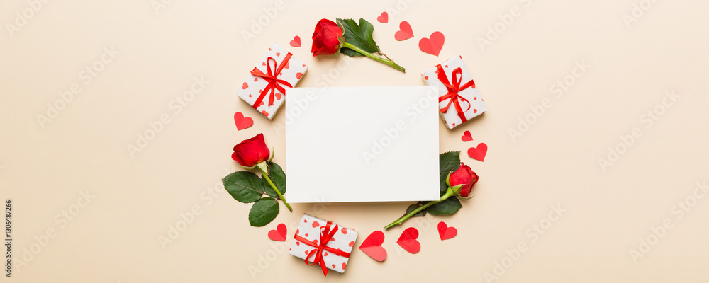 Frame made of rose, git box, heart and blank greeting card mockup on Colored background. Top view, flat lay, copy space Holiday, Mothers Day, birthday concept