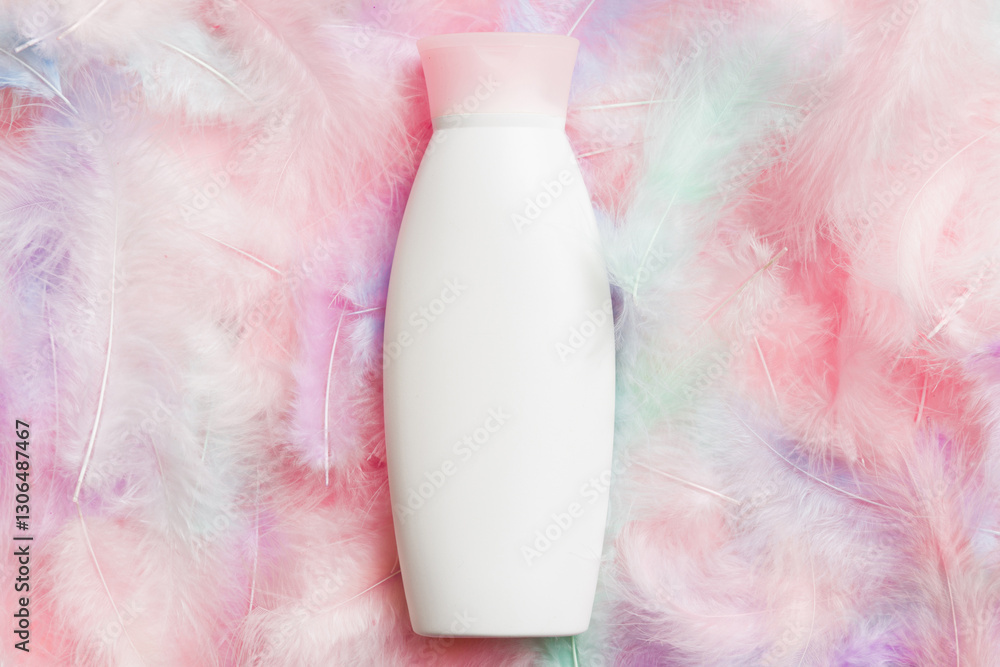 Spa cosmetic product, cream bottle, branding mock up, top view with feathers background. Flat lay