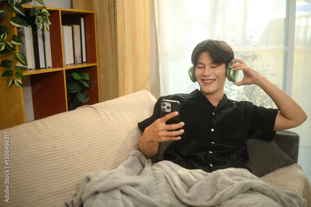 Cheerful young asian man wearing wireless headphones and watching something on smartphone