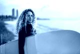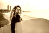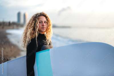 Joyful young woman carrying a surfboard on a beach, her face filled with happiness and excitement