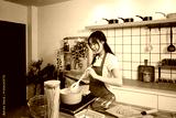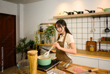 Young woman stirring spaghetti in a boiling pot and checking a recipe on digital tablet