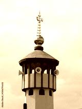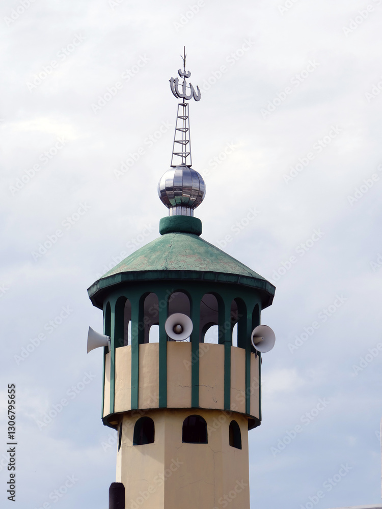 A shiny mosque dome under a cloudy sky
