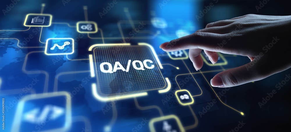 QA QC Quality Assurance and Quality Control for Product Excellence, projection on a virtual screen, Business and Technology Concept.