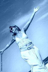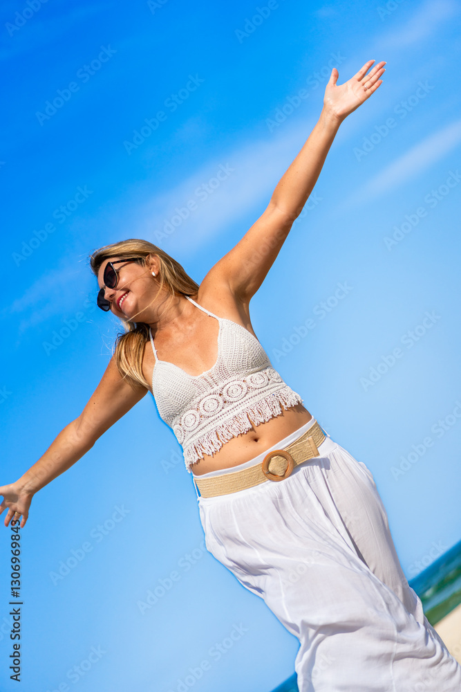 Beautiful middle-aged woman enjoying holidays on white sandy beach on sunny summer day. Happiness and freedom. Front view