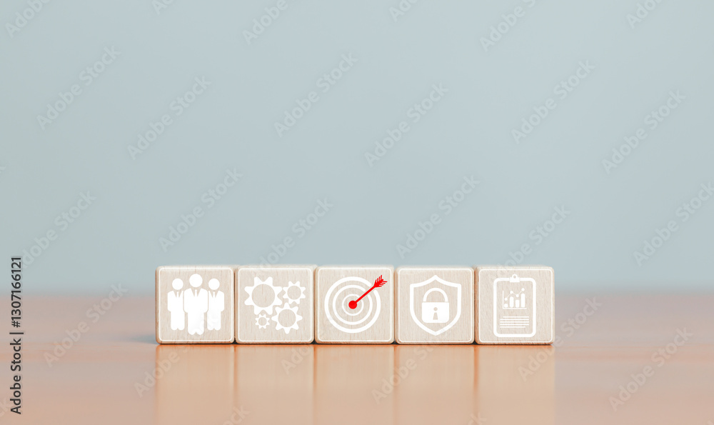 Target icon on wooden block. Strategic planning for business growth and target audience. Business target setting, value, growth