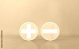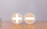 Wooden blocks with plus and minus signs. Concept of opposites. Decision making. Choosing a positive or negative business. Analysis of pros and cons. Comparison of plus and minus signs. Copy space.