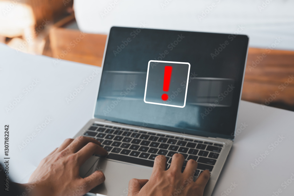 Businessman hand showing white exclamation mark. Error warning, notification, maintenance and troubleshooting.