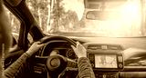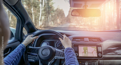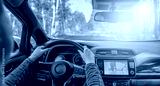 A woman driving an electric car on an asphalt road with a forest in the background.