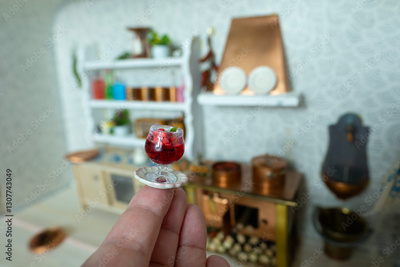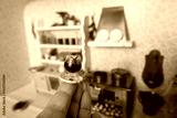 retro-style miniature dollhouse scale kitchen roombox with handcrafted furniture, dishes and utensils, miniature enthusiasts