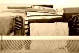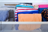female hands close-up, woman lays out women's things, knitwear in white mesh metal basket of closet, taking care of oneself and finding moments of relaxation in the midst of daily tasks