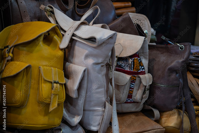 Colorful Vibrant leather handmade Moroccan bags, goods for sale in traditional local souk, story heritage and authentic oriental craftsmanship, artisanal culture Morocco