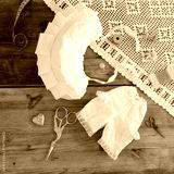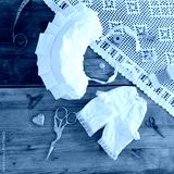 Victorian doll undergarments, Handmade historical doll lingerie set, Vintage doll lingerie set with lace, handmade sewing accessories on rustic wooden background. Retro-style craftsmanship concept