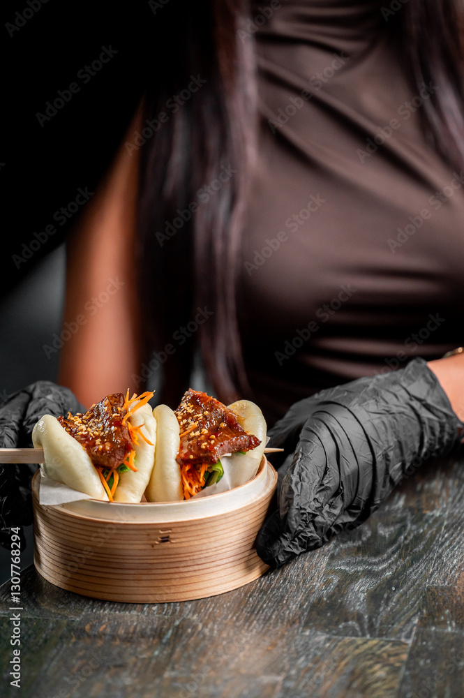 A close-up of a person in black gloves holding a bamboo steamer with two delicious bao buns filled with colorful vegetables and sauce, set against a moody backdrop.
