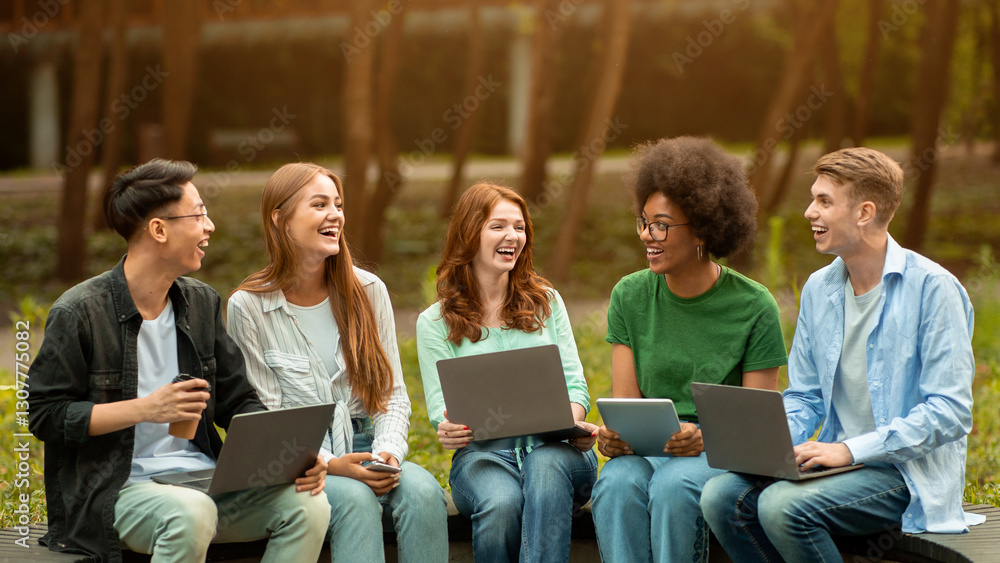 Diverse Multicultural Students Studying Outdoors With Different Electronic Devices, Sitting Together On Bench At University Campus