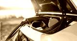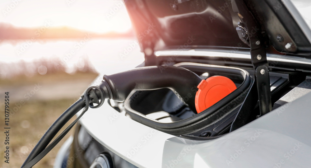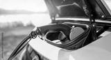 Electric vehicle with an open charging port, showcasing a black charging cable inserted into the port.
