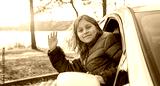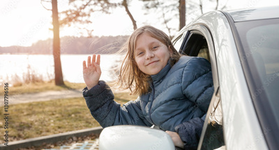 Cute happy little boy waving hand while standing by a car on a sunny day. Blurred sunshine and lake background.