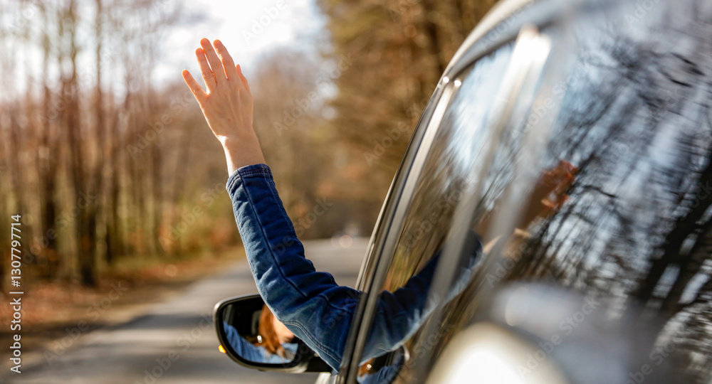 Close up of woman's hand waving out of a car window. Driving a car in a road on a sunny day.