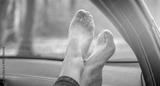 Close up of woman legs in jeans and bare feet resting on cockpit car window in autumn forest.