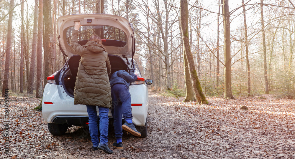 A woman and a child stand by the trunk of a white car in a forest setting.