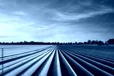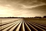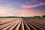 Sunset on agricultural field with plowed even rows for growing potatoes. Dramatic sky on sunset time in early spring. Landscape photography