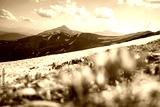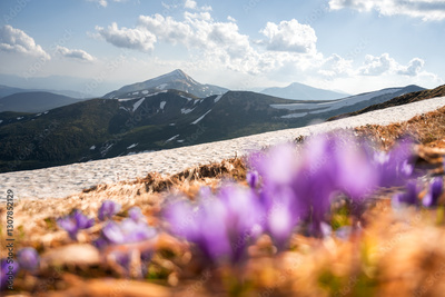 Springtime in the mountains with colorful crocus flowers in full bloom under the sun