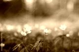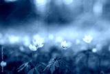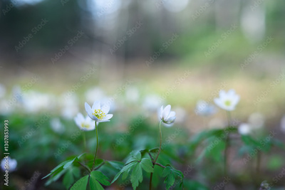 Soft-focus close-up of Anemone flowers scattered across a vibrant spring forest floor