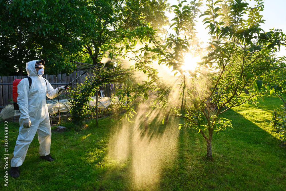 Fruit tree protection in early spring - gardener in protective clothing applying chemical treatment