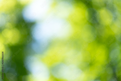 Blurred green leaves and shining through it sunlight in spring forest. Nature background