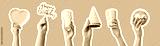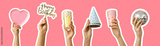 Birthday party accessories, set of hands with birthday party accessories on pink background