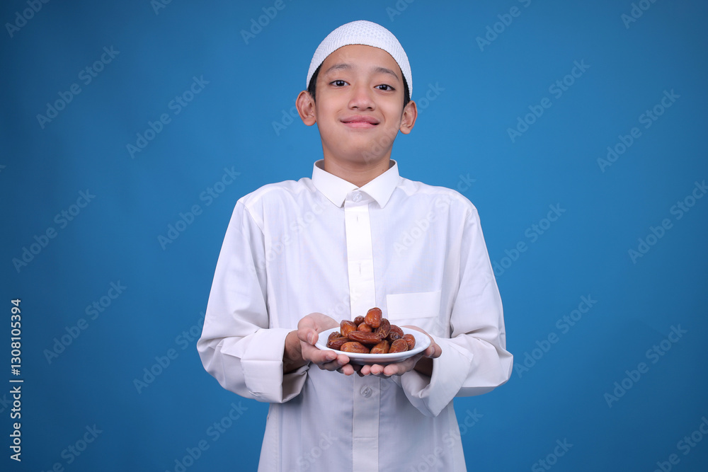 Muslim Teenage Boy Offering Dates Fruit To Front Over Blue Background